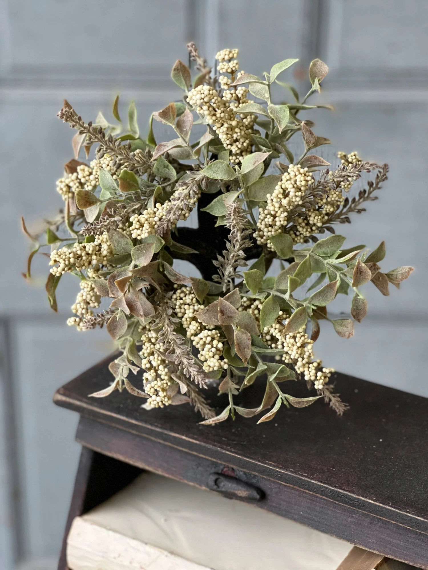 A collectionwith a crisp and cool feel made up of spires of bubble berries and lavender-like shoots tucked into leaves with a felted effect.