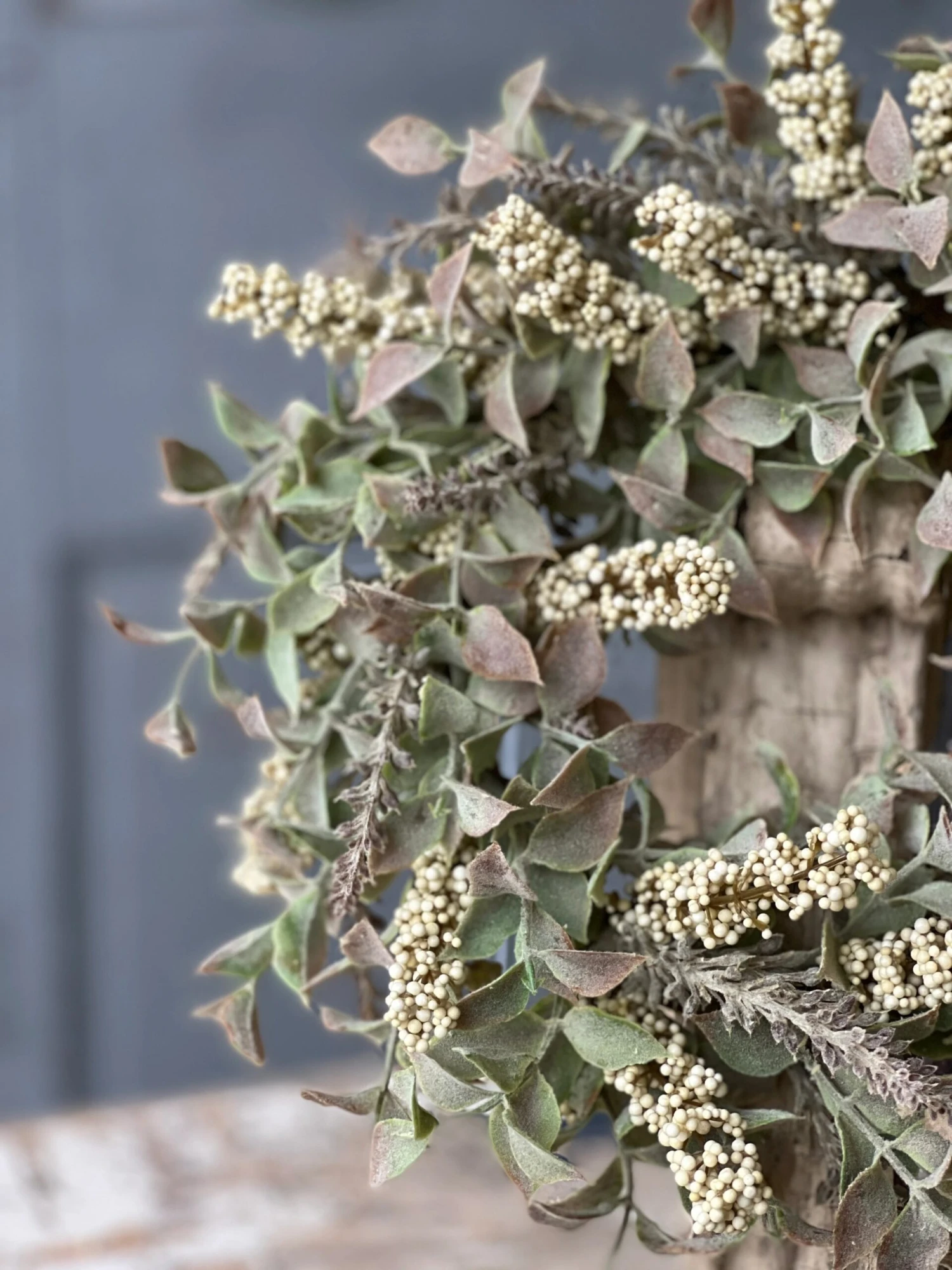 A collectionwith a crisp and cool feel made up of spires of bubble berries and lavender-like shoots tucked into leaves with a felted effect.