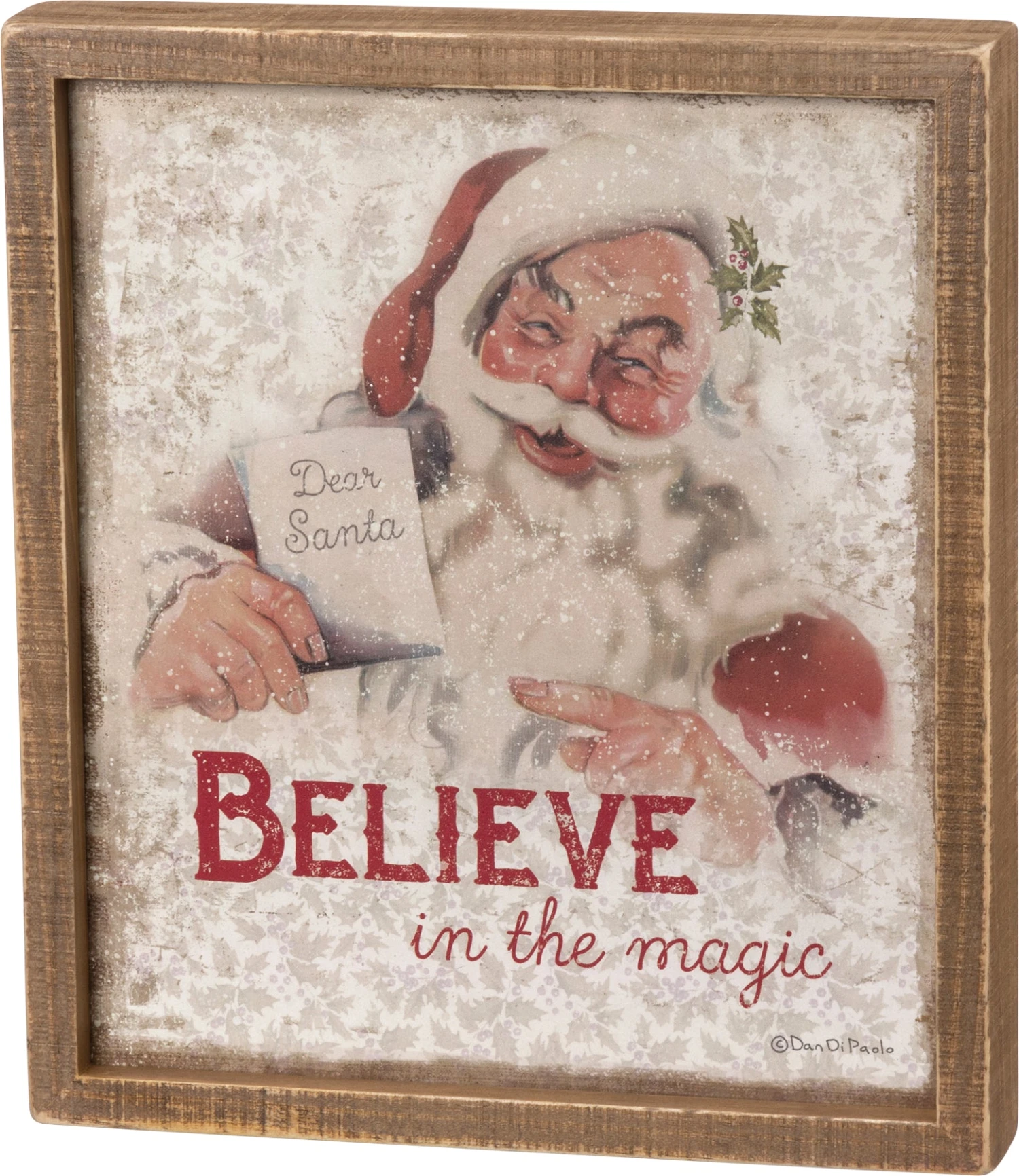 A timeless holiday staple piece, this inset box sign features a vintage-inspired Santa Claus design, “Believe In The Magic” sentiment, and natural wood trim.