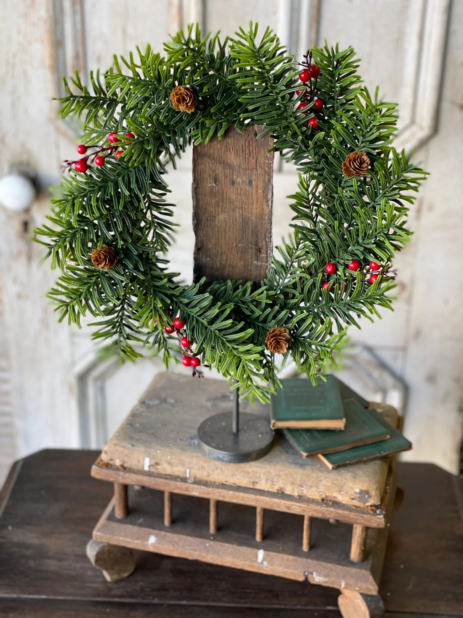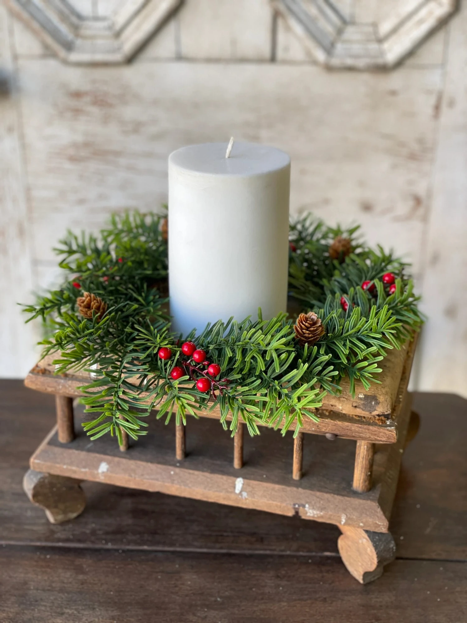A beautiful background of fringed greenery sets the perfect stage for bold berries and small pine cones.