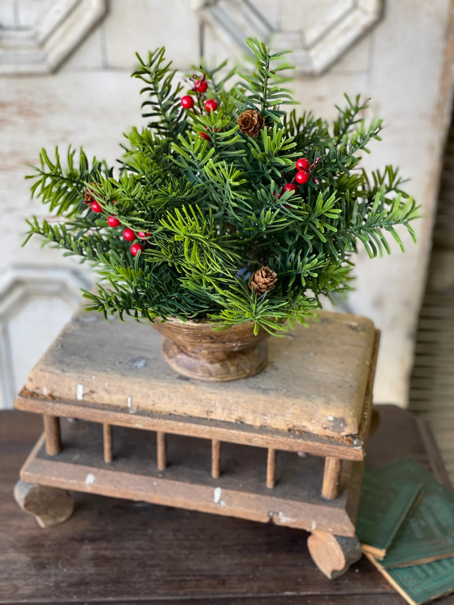 A beautiful background of fringed greenery sets the perfect stage for bold berries and small pine cones.