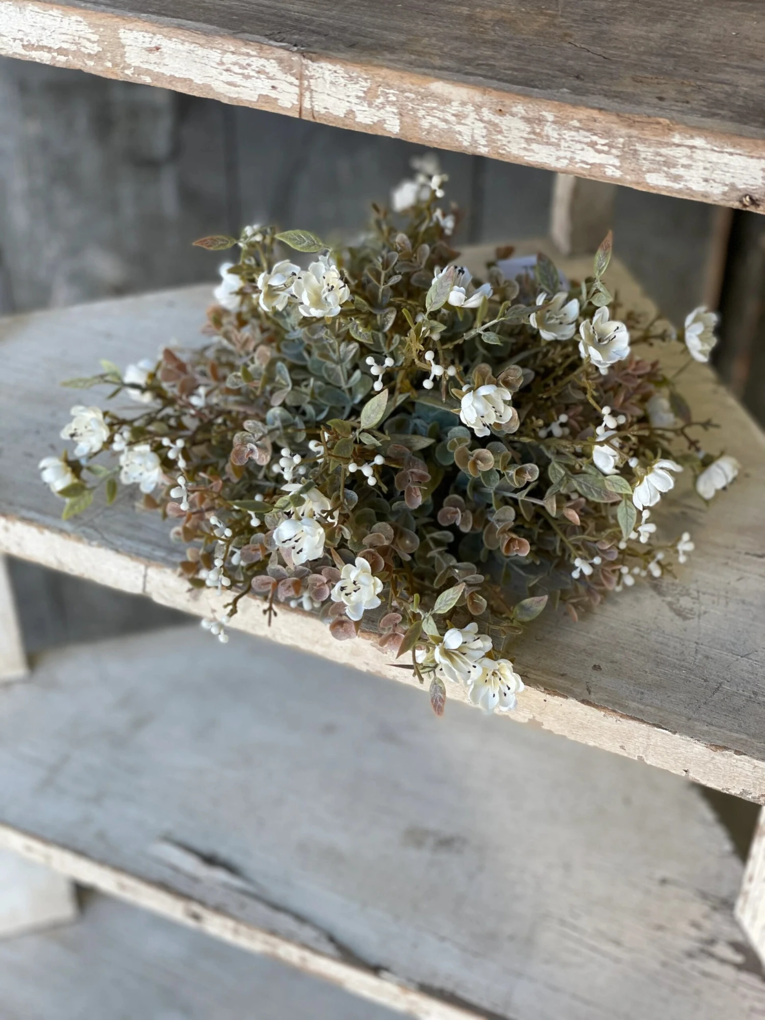 This collection features small, colorful rosettes peppered throughout a bed of mixed, lightly-powdered greenery with small berry-like orbs.