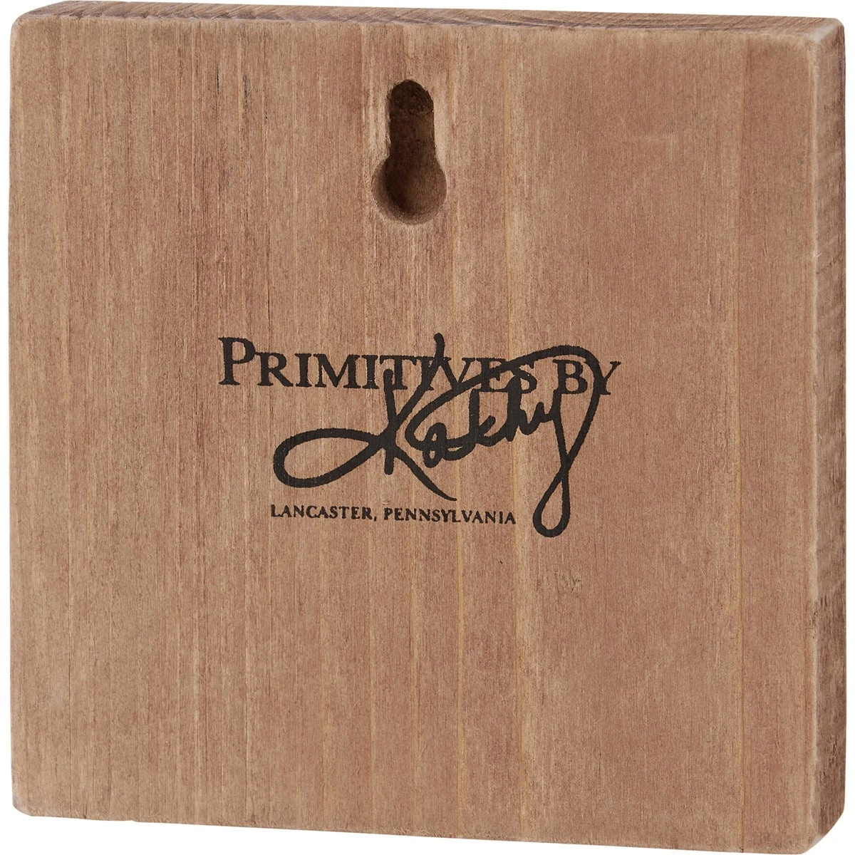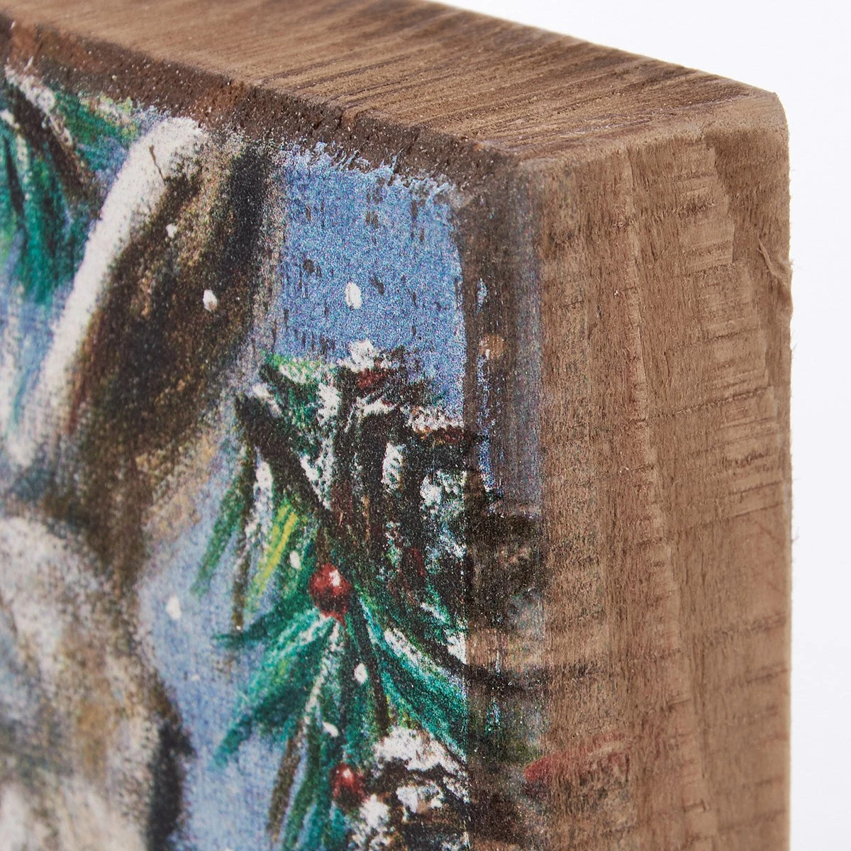 A wooden block sign displaying a bunny with snowy woodland background and natural stained wood sides. Design is replicated from original artwork painted onto burlap canvas, giving the art a unique depth and texture. Our bunny block sign is easy to hang via predrilled keyhole slot or can free-stand alone.