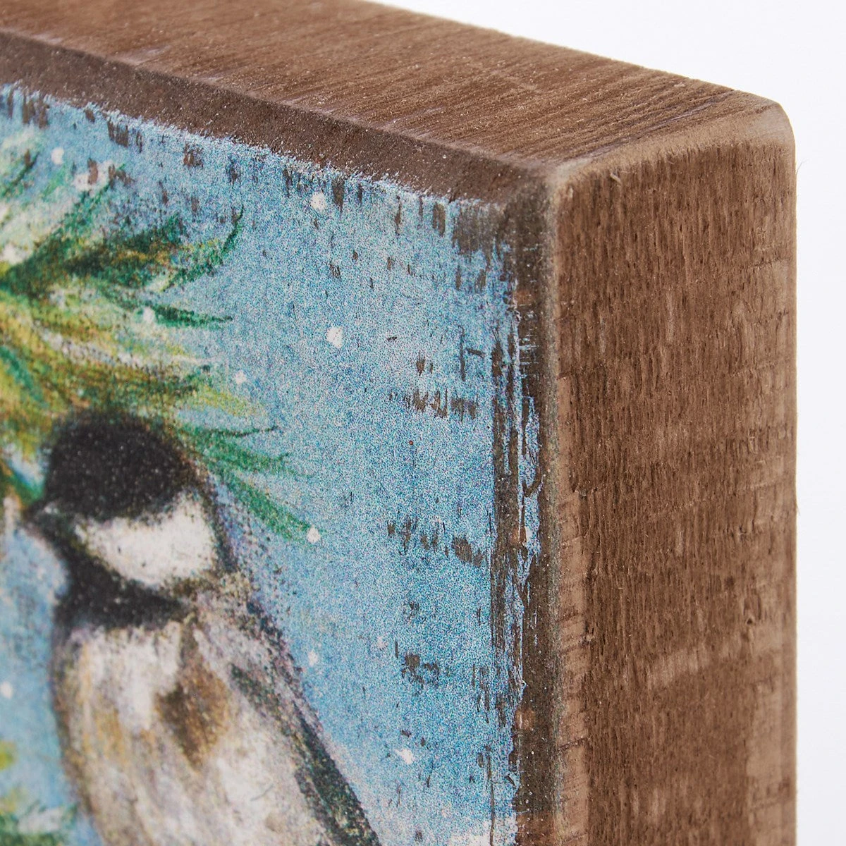 A wooden block sign from ourdisplaying a chickadee with snowy woodland background and natural stained wood sides. Design is replicated from original artwork painted onto burlap canvas, giving the art a unique depth and texture. Our chickadee block sign is easy to hang via predrilled keyhole slot or can free-stand alone.