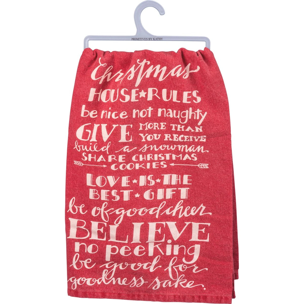 A rustic-inspired muted red kitchen towel lending hand lettered “Christmas House Rules Be Nice Not Naughty Give More Than You Receive Build A Snowman Share Christmas Cookies Love Is The Best Gift Be Of Good Cheer Believe No Peeking Be Good For Goodness Sake” sentiments.