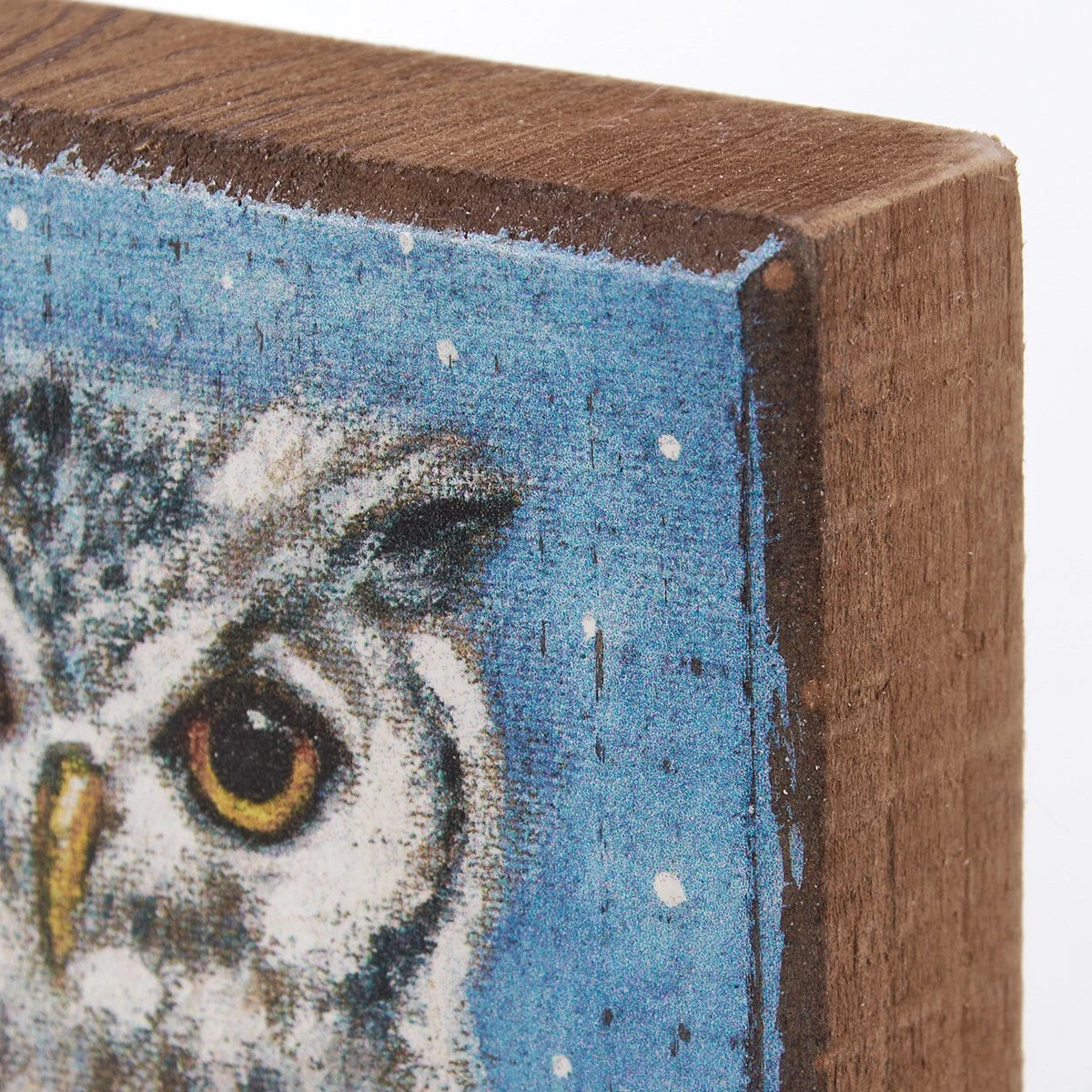 A wooden block sign displaying a owl with snowy woodland background and natural stained wood sides. Design is replicated from original artwork painted onto burlap canvas, giving the art a unique depth and texture. The owl block sign is easy to hang via predrilled keyhole slot or can free-stand alone.