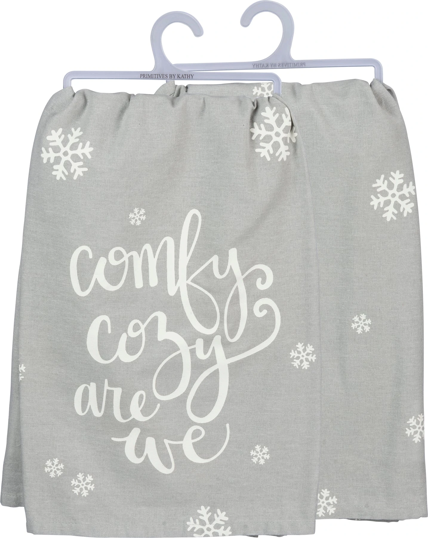 A gray and white cotton kitchen towel featuring a hand lettered “Comfy Cozy Are We” sentiment with snowflake designs throughout.