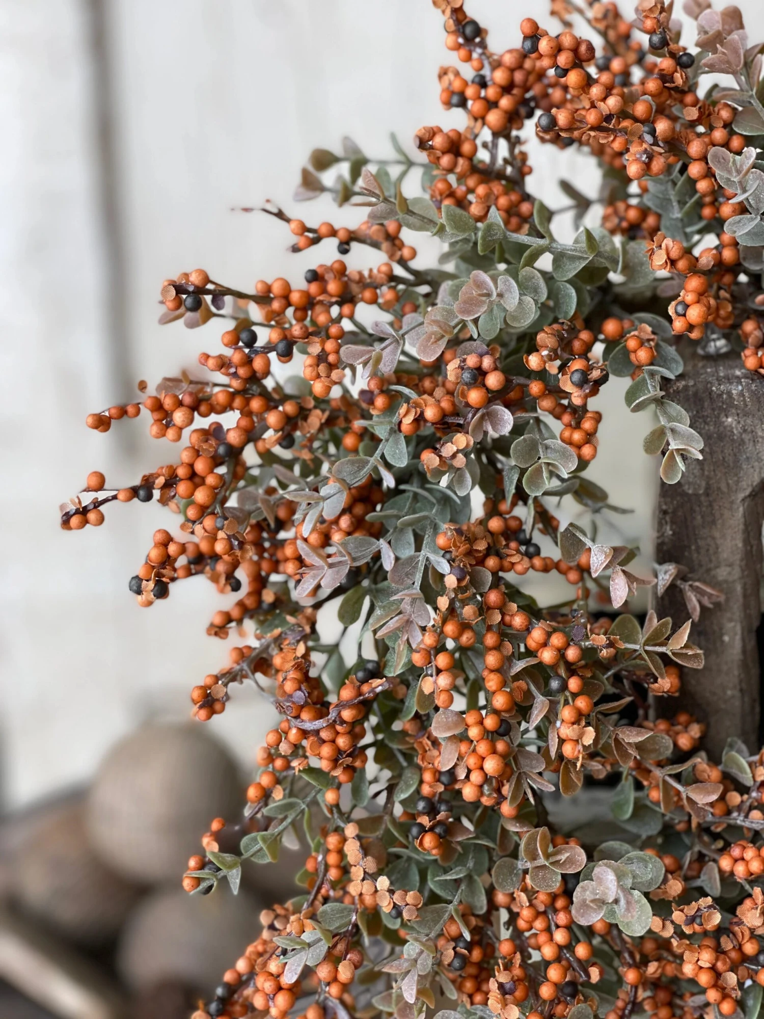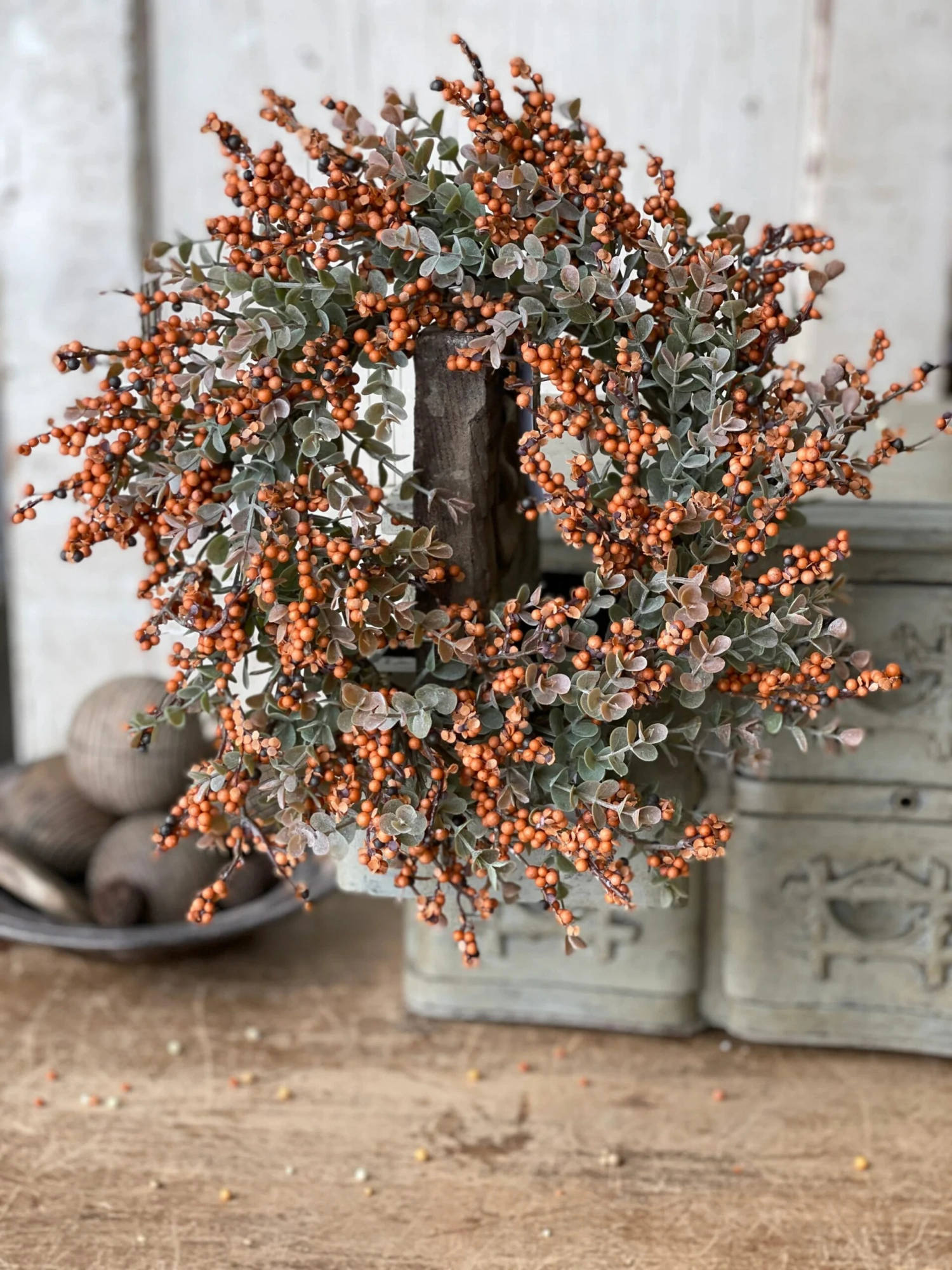 Lovely eucalyptus-like foliage makes a beautiful backdrop for branching stems with bubble berries and small petals.