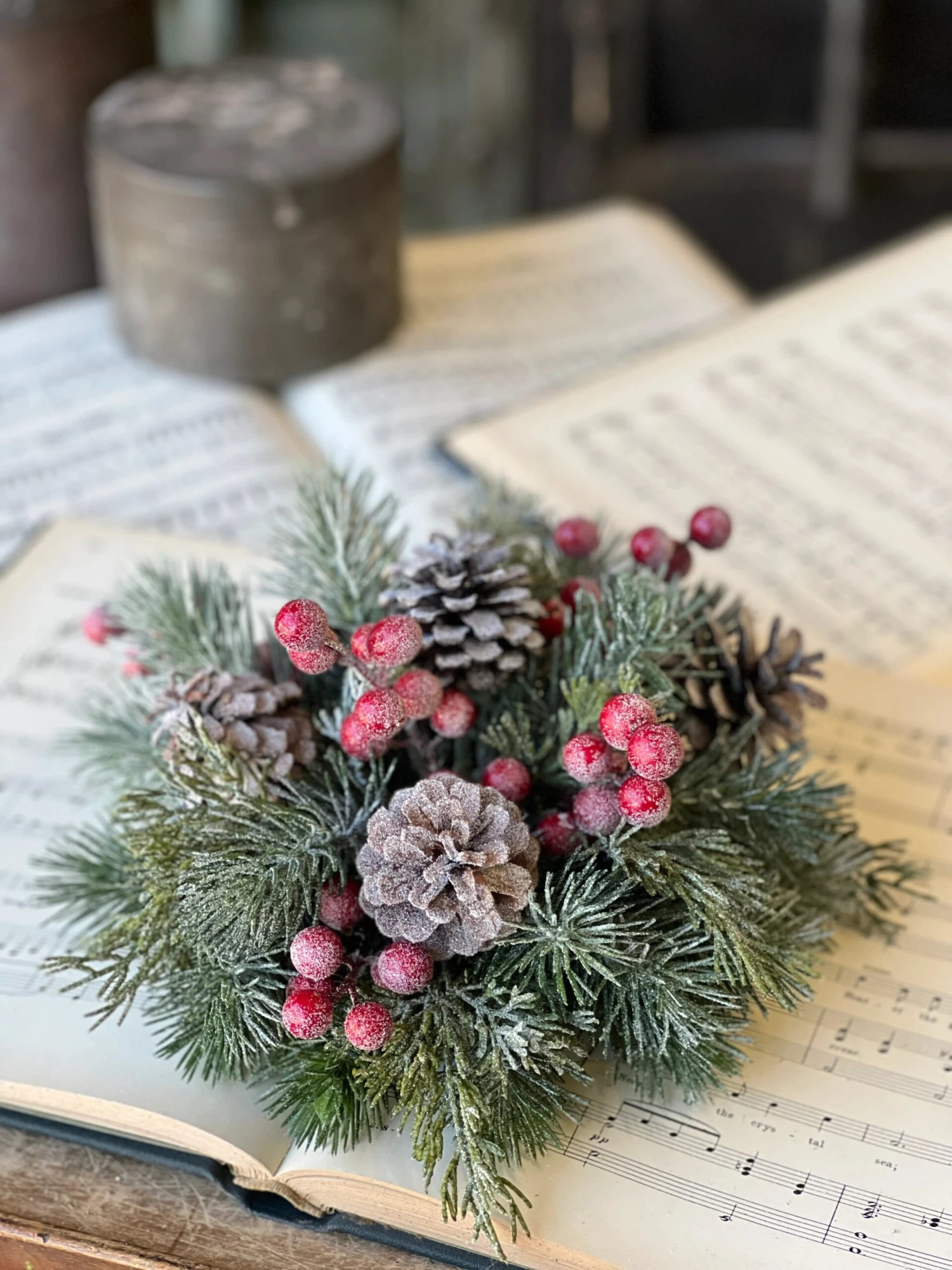 A classic blend of fir, red berries and natural pine cones dusted with an ultra fine frost.