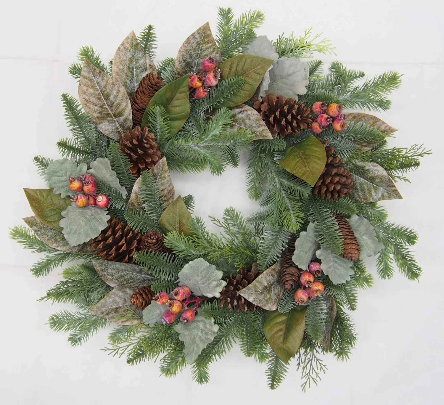 Realistic faux botanicals are hand-selected and gathered to make up this beautiful wreath. Evergreens and frosted gray foliage’s are mixed to create the unique texture.