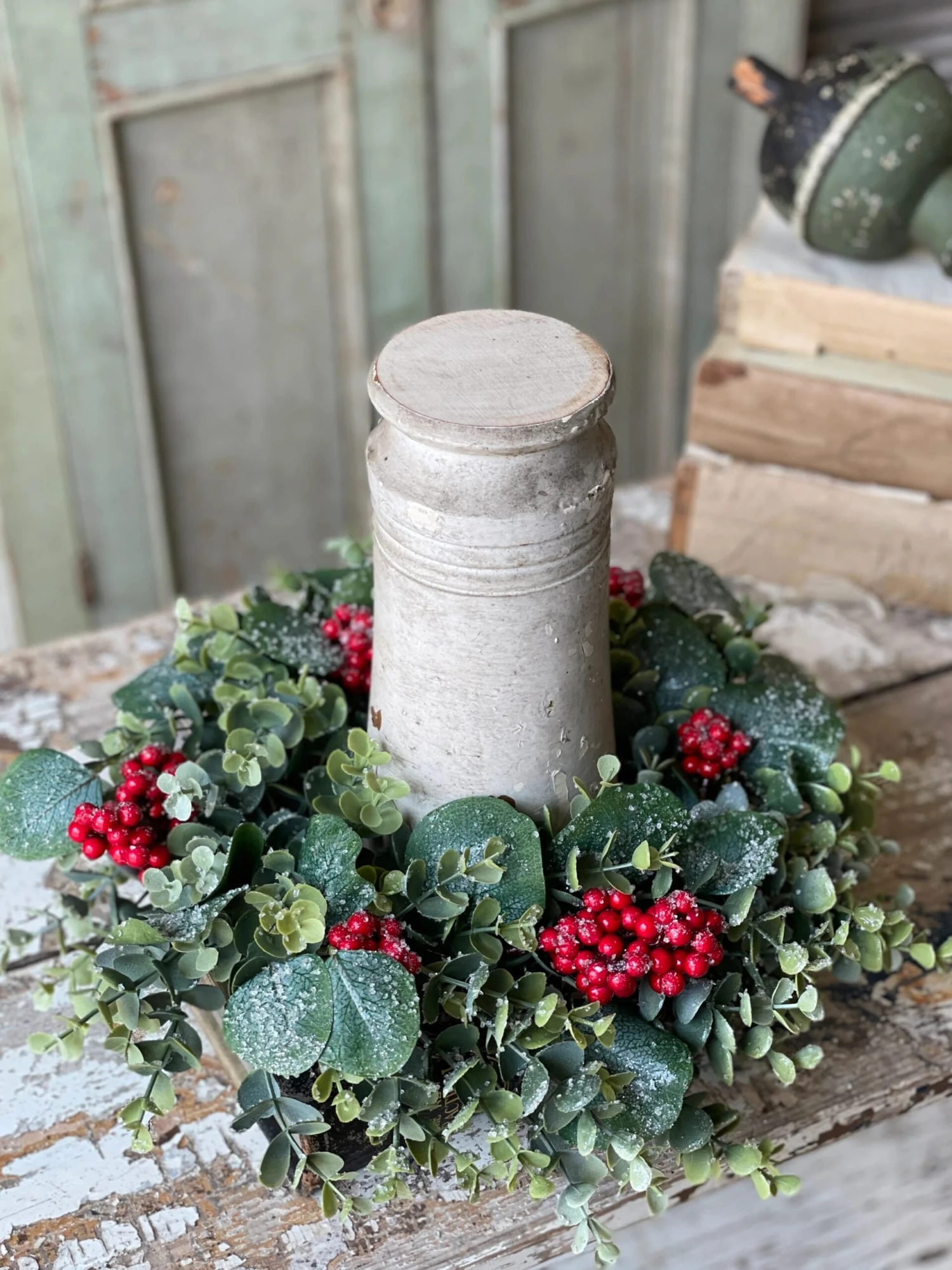 An gorgeous collection of mixed eucalyptus with striking clusters of red berries. The leaves are topped with small ice chips and glitter to add extra interest.