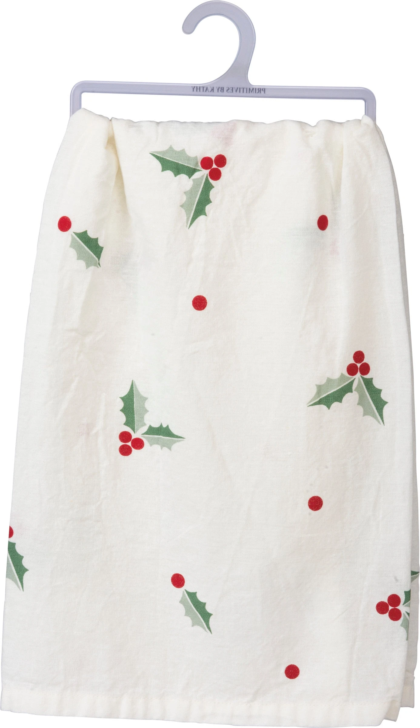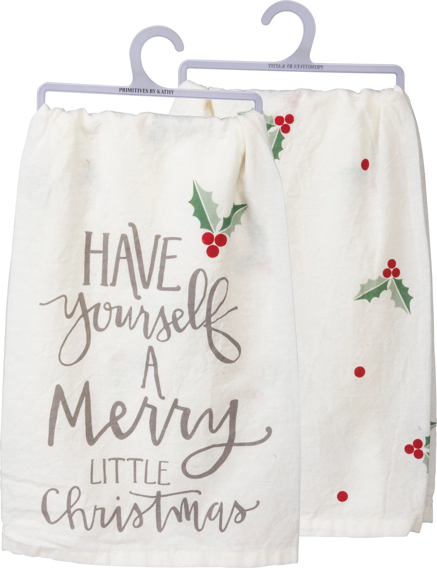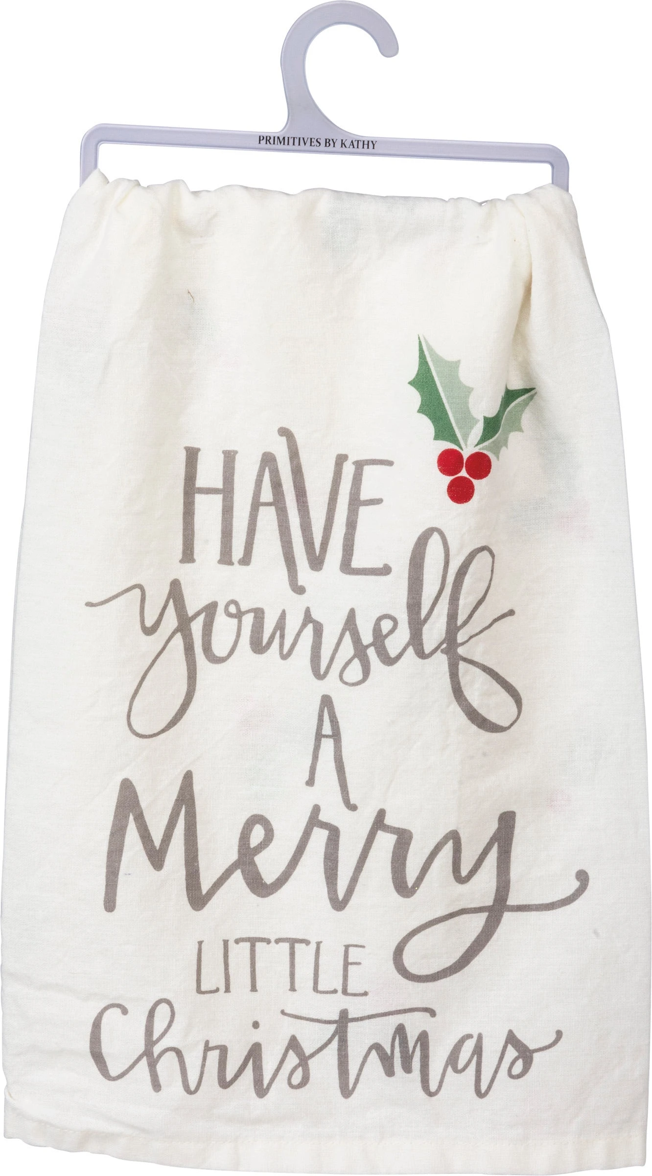 A cotton dish towel featuring a festive hand lettered “Have Yourself A Merry Little Christmas” sentiment with holly and dot designs throughout in a neutral palette. Machine-washable.