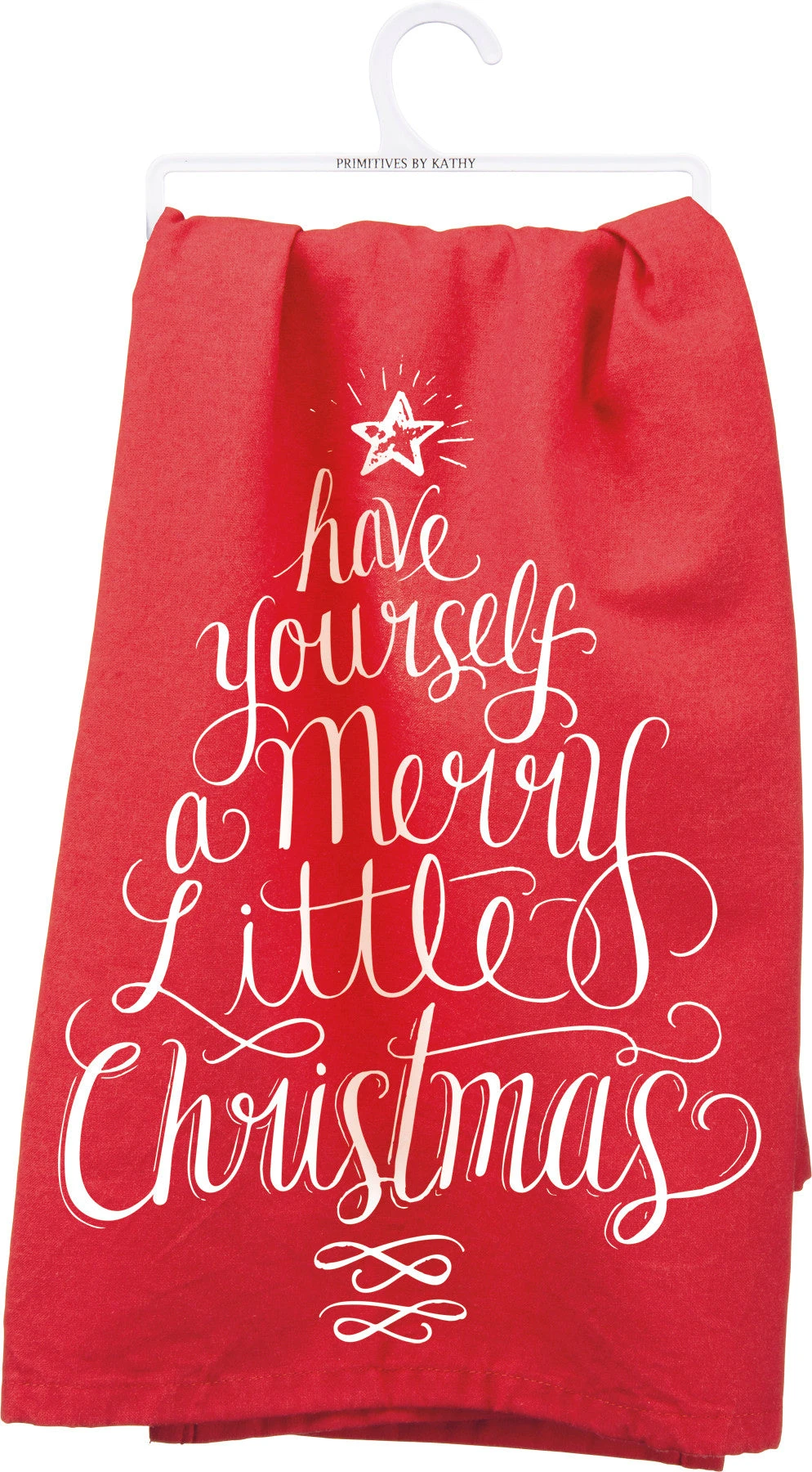 A red and white cotton kitchen towel featuring a hand lettered “Have Yourself A Merry Little Christmas” sentiment in a tree silhouette with star design.