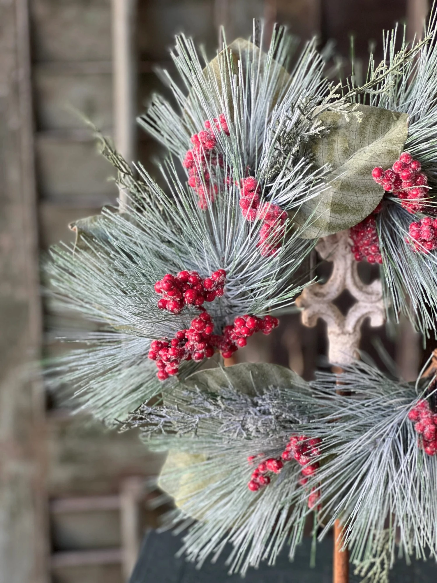 Cool toned pine needles with an icy finish make a beautiful backdrop for clusters of red berries, cedar sprigs, and magnolia leaves. The berries feature small ice crystals for an extra measure of texture.