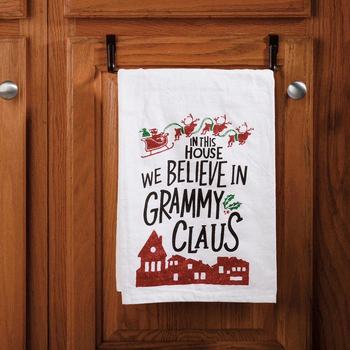 A cotton kitchen towel featuring “In This House We Believe In Grammy Claus” sentiment with festive designs. Machine-washable.