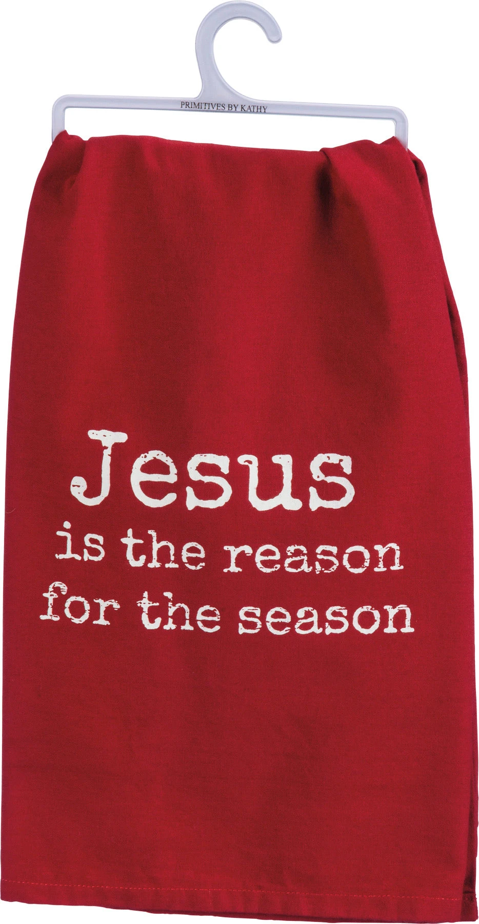 A cotton dish towel featuring a distressed “Jesus Is The Reason For The Season” sentiment.
