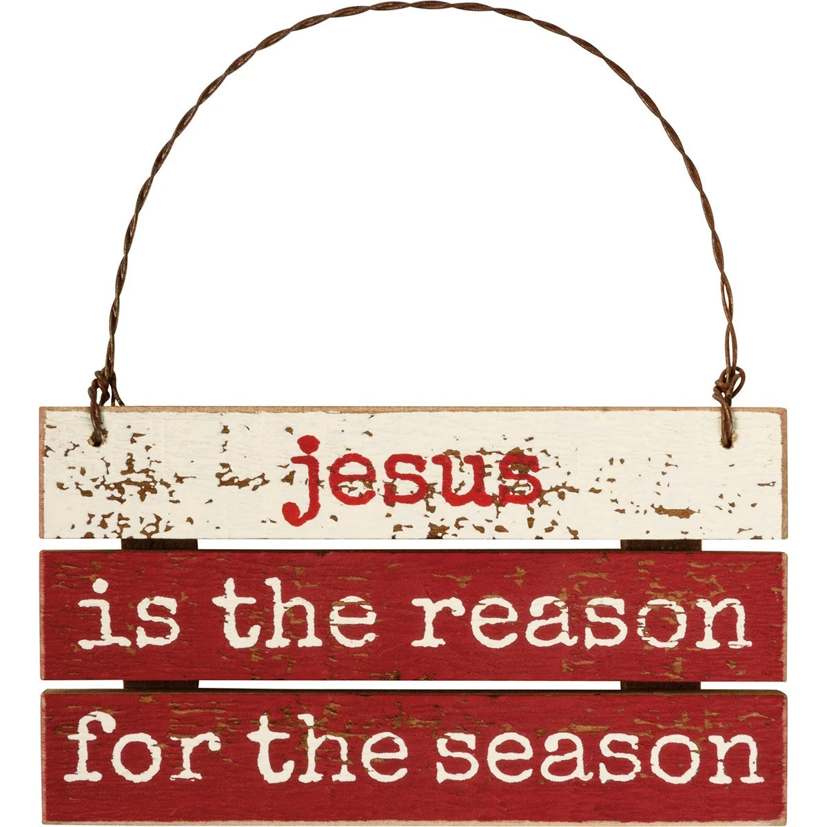 A rustic slat wood ornament featuring typeset “Jesus Is The Reason For The Season” sentiment and a holiday palette. Hangs easily by twisted wire loop.