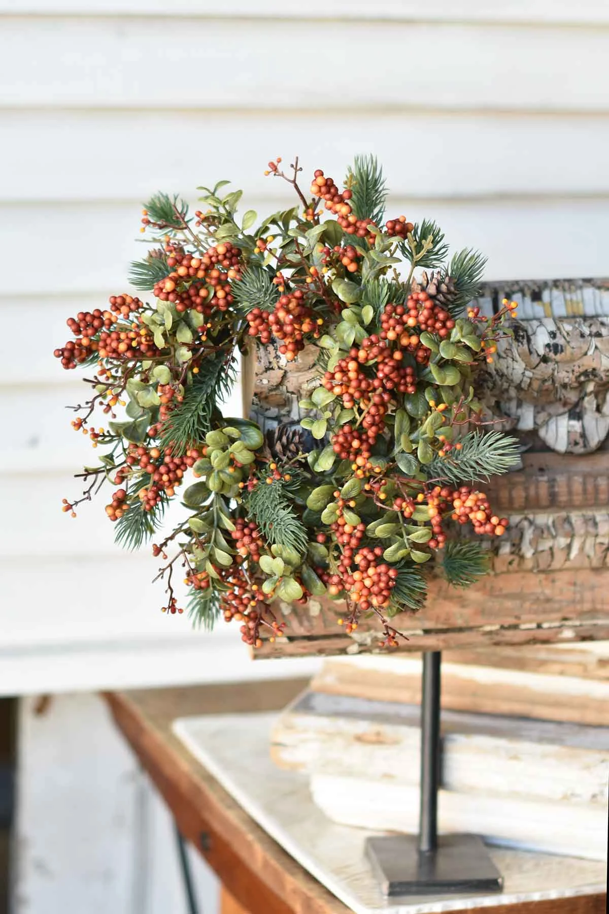 A wonderful assembly of spruce and greenery, pine cones, bubble berries and branching accents.