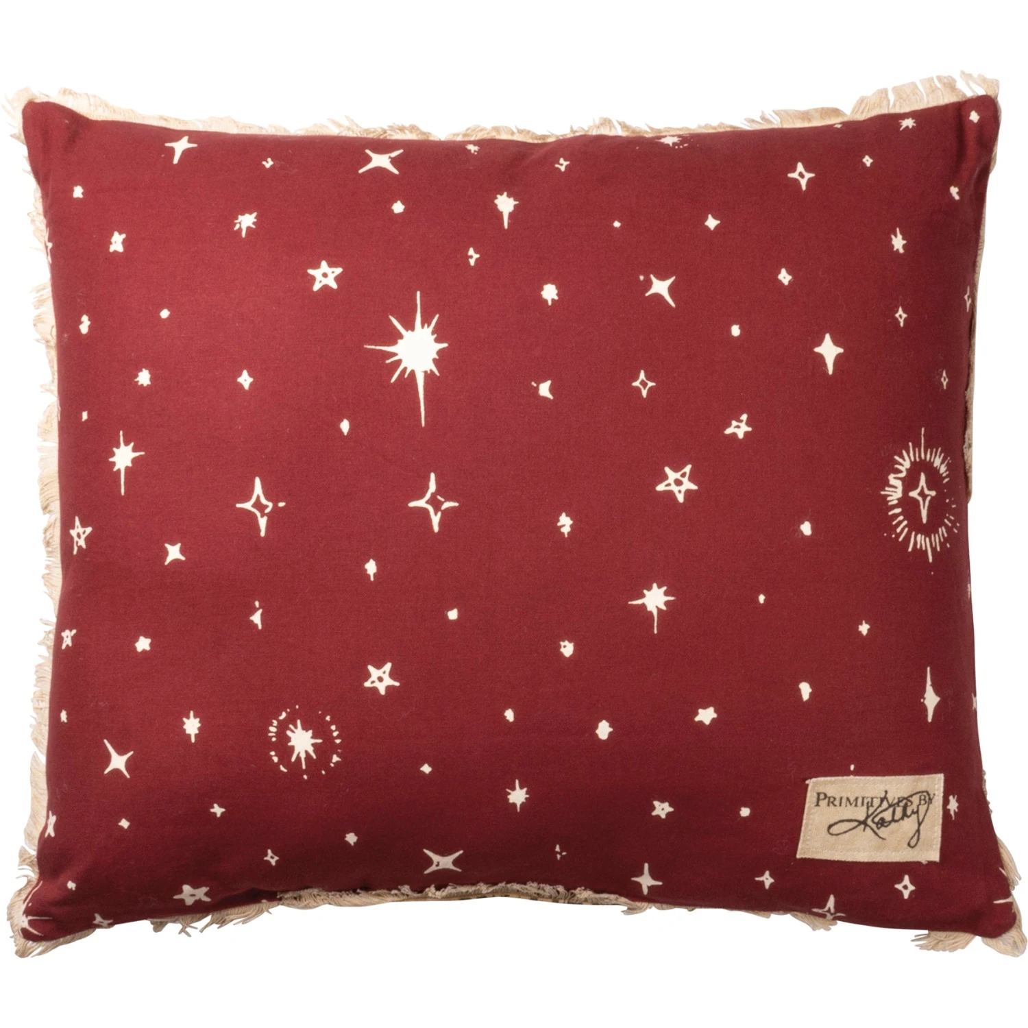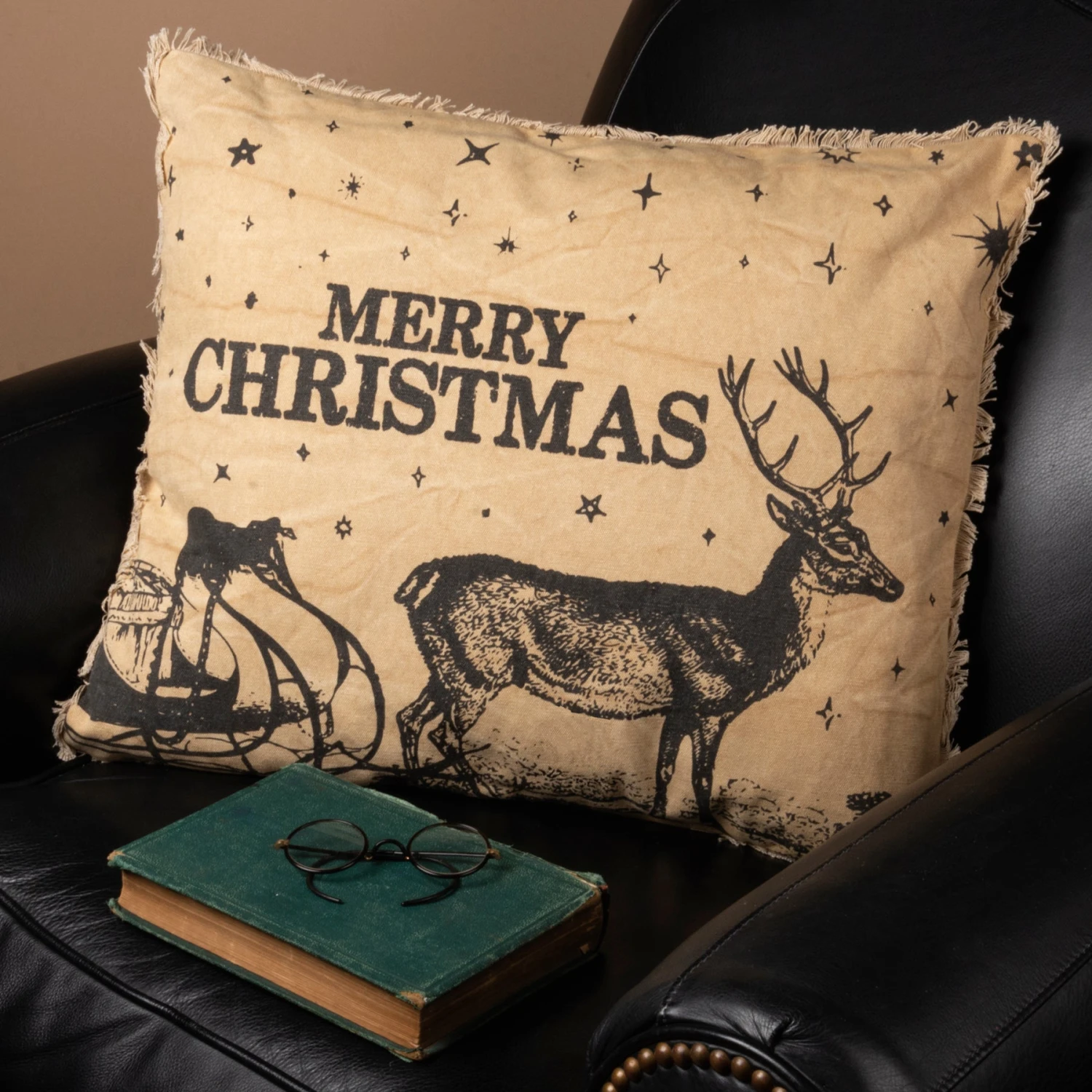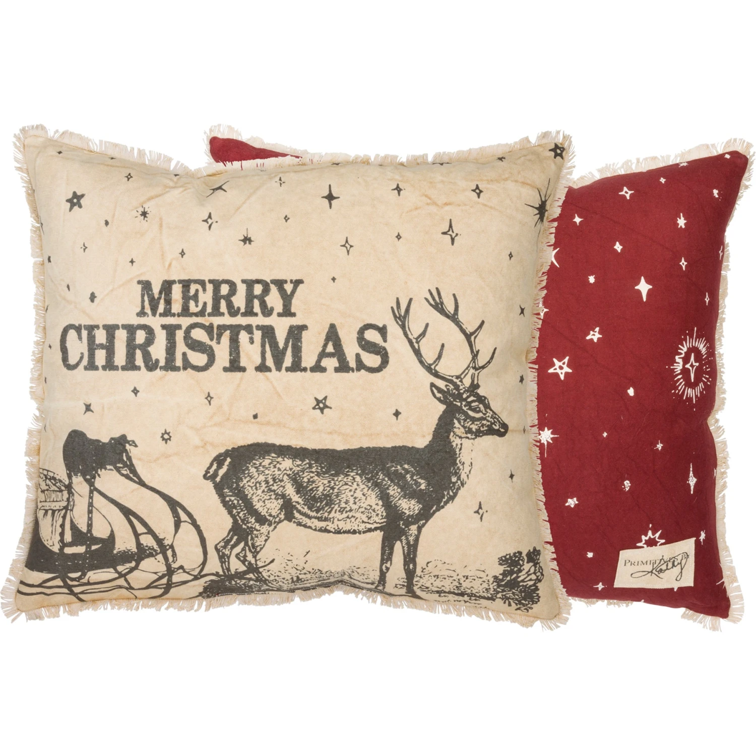 A canvas pillow lending a distressed “Merry Christmas” sentiment, reindeer and sleigh front design, reverse star print, and fringe trim in a neutral festive palette. Polyester filling. Includes a zipper to easily remove and clean cover.