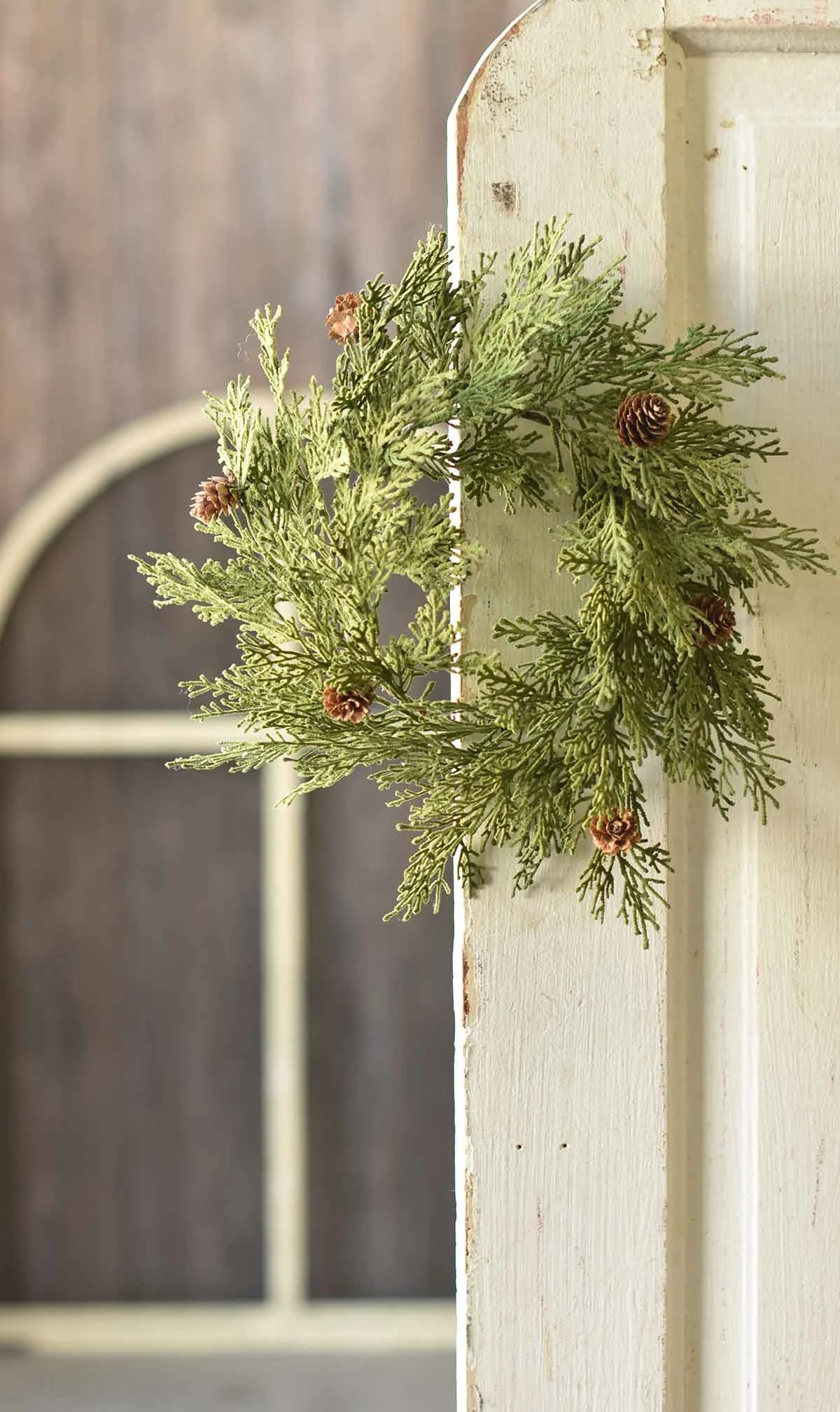 A beautiful and textural collection of greenery featuring broad leaved foliage and natural pine cones.