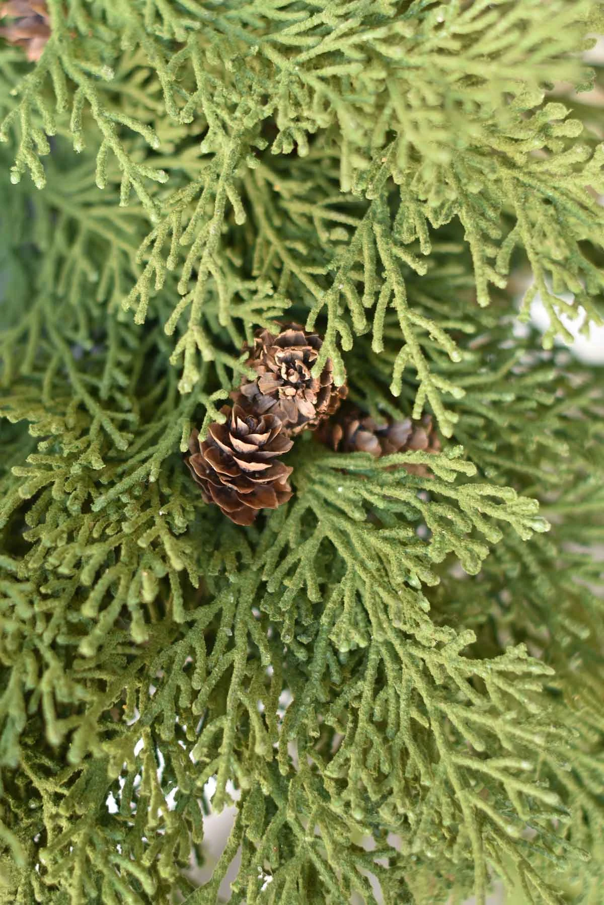 A beautiful and textural collection of greenery featuring broad leaved foliage and natural pine cones.