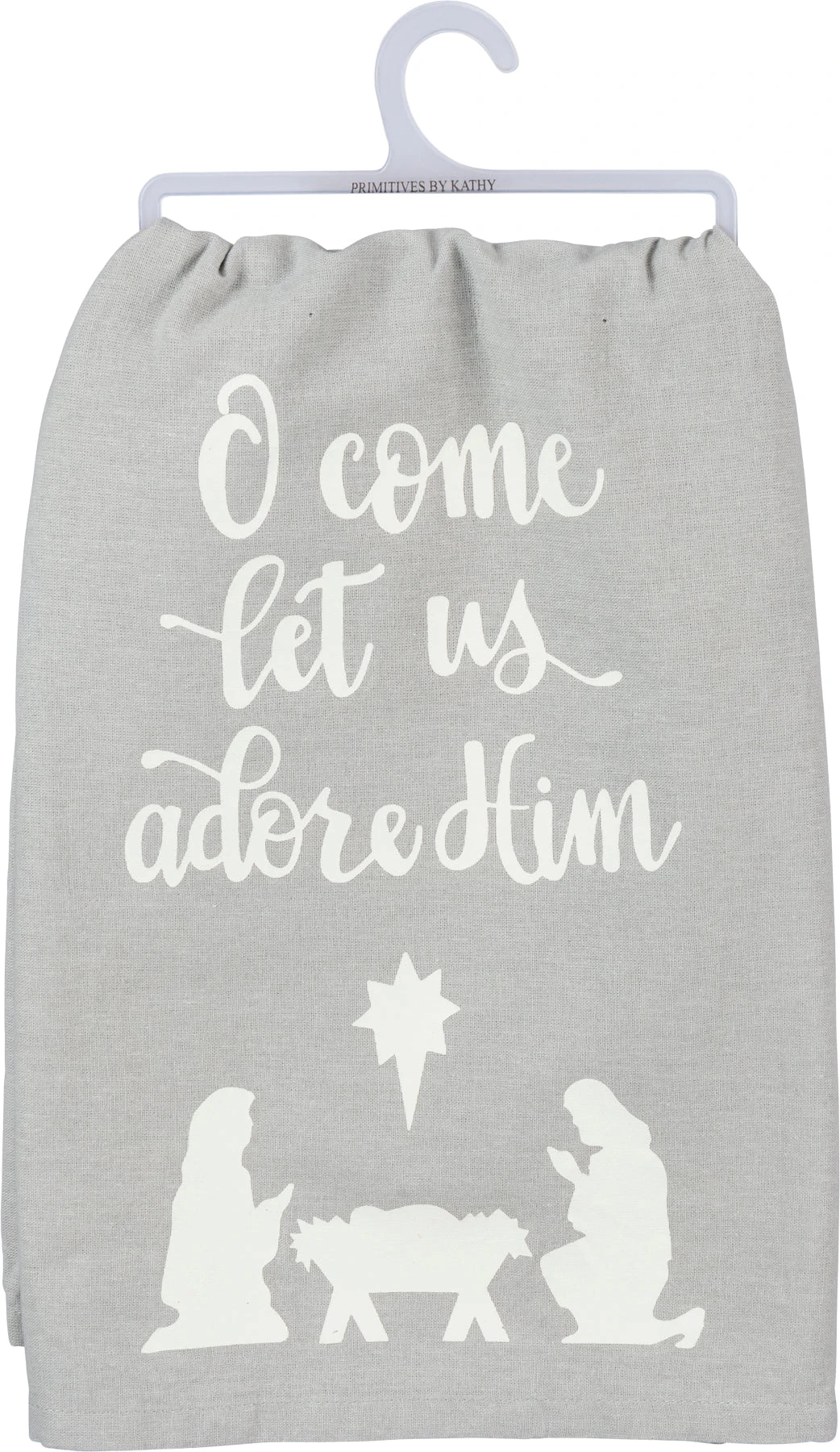 A gray and white cotton kitchen towel featuring a hand lettered “O Come Let Us Adore Him” sentiment with nativity scene design. Complements well with existing decor or coordinating styles. Machine-washable.