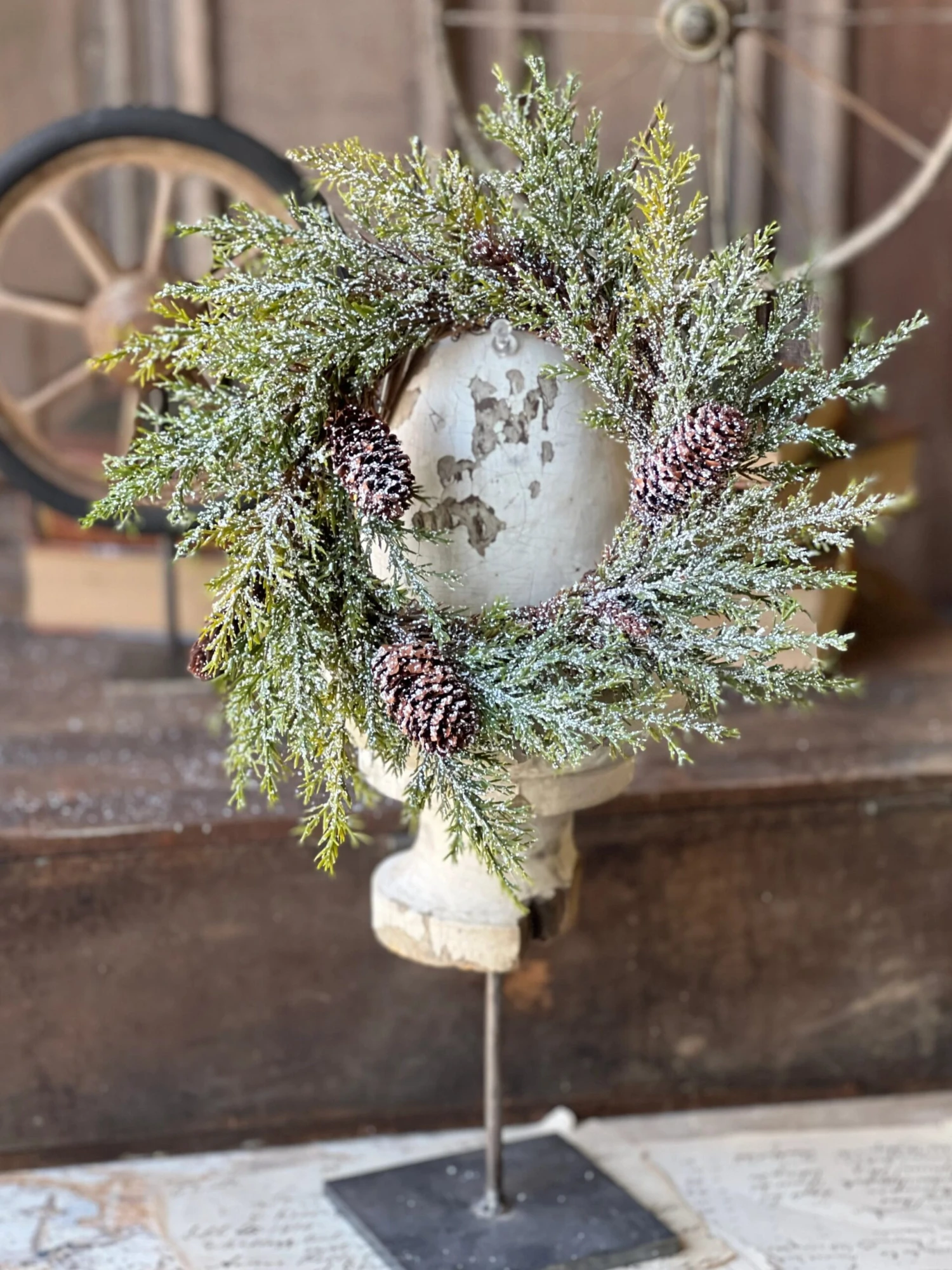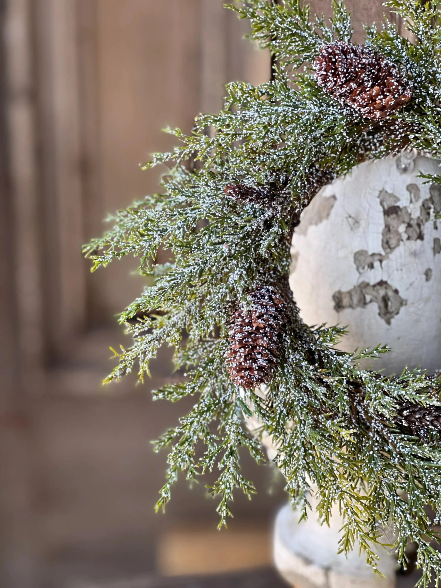 A snowy finish tops shifting shades of pine greenery with a bronzy undertone peppered with two types of pine cones to create a collection with a natural, woodsy feel.