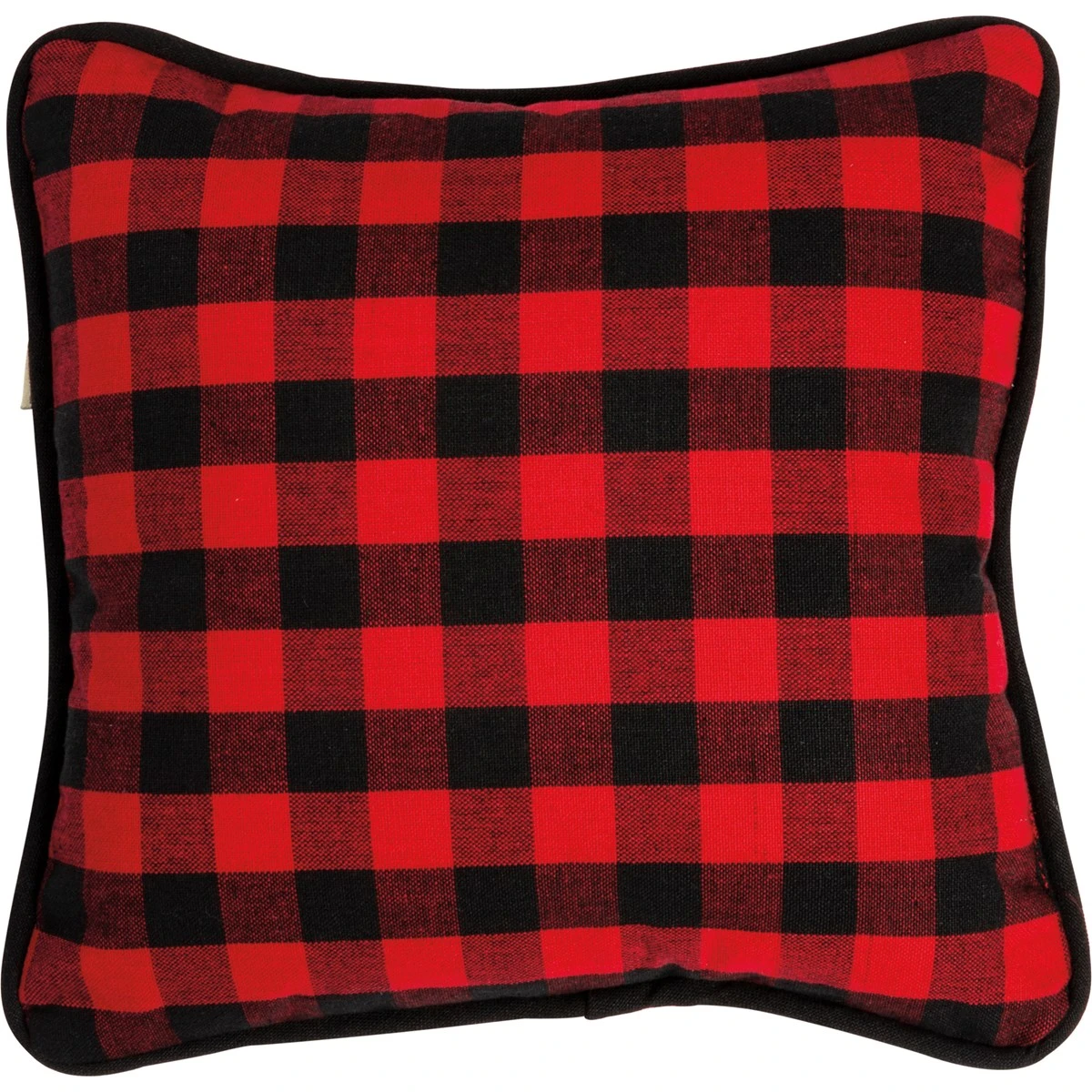 A cotton pillow featuring a double-sided small red and black buffalo check pattern and solid black piping. Polyester filling. Includes a zipper to easily remove and clean cover.