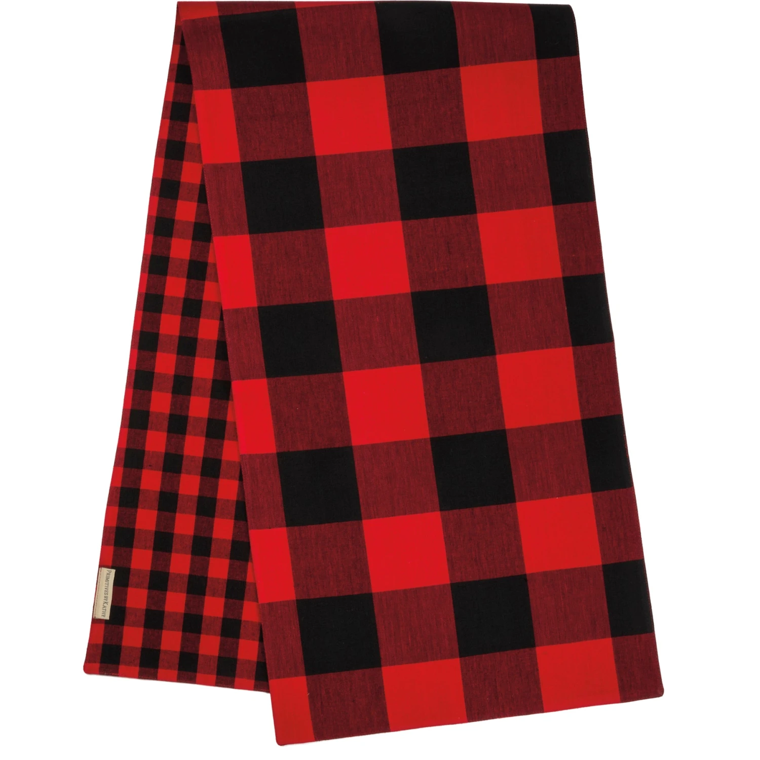 A double-sided cotton table runner featuring a 3″ red and black buffalo check pattern on one side, and a 0.75″ buffalo check pattern on the other. Machine-washable.