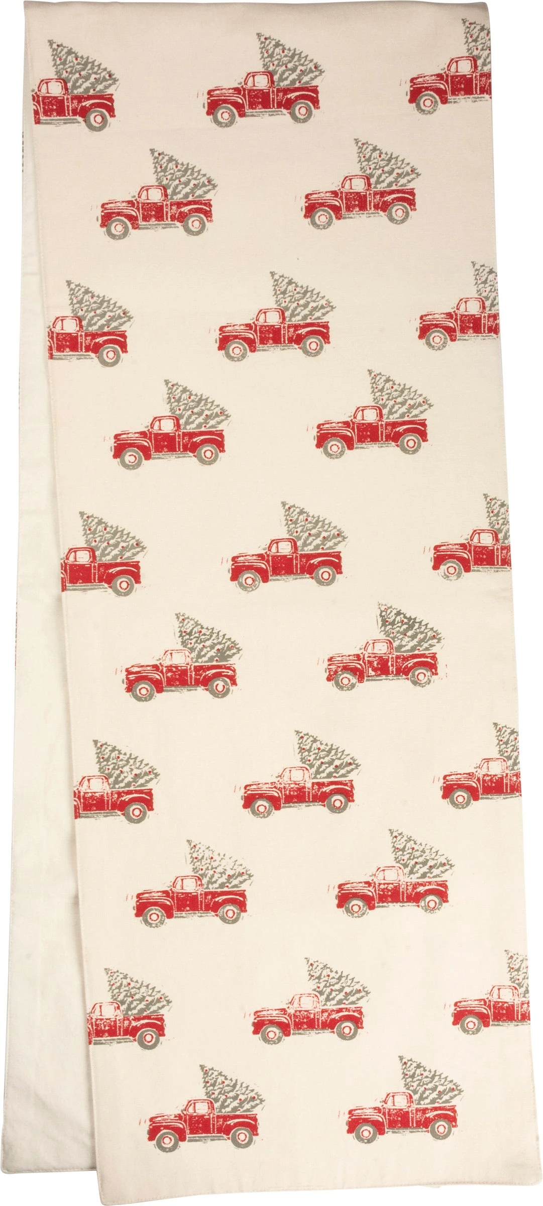 A cotton table runner created with intricate age-old block carving and printmaking techniques. Features replicated red truck and tree designs throughout. Machine-washable.