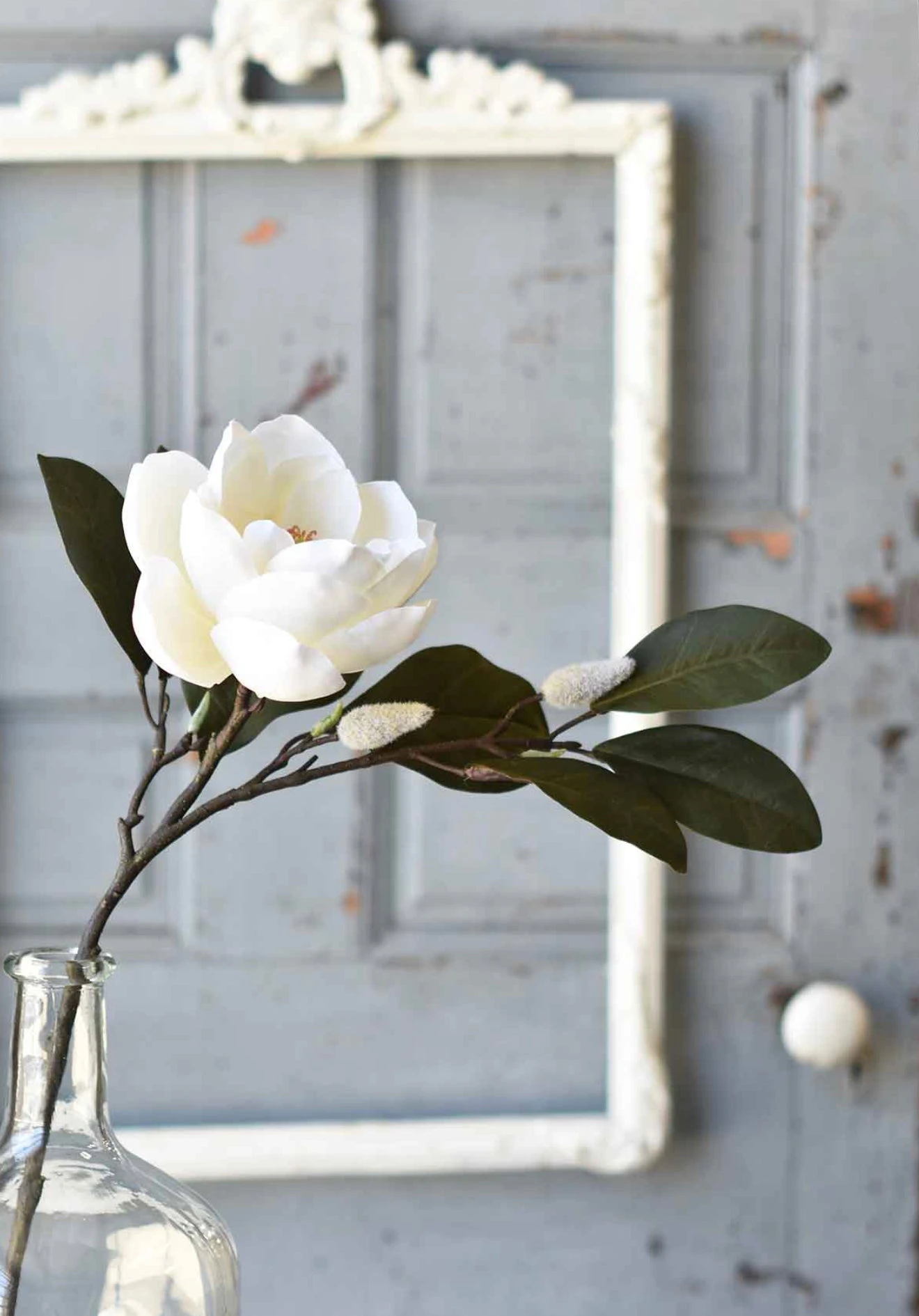 Gorgeous multi-petaled blooms and buds grace stems of magnolia leaves to create a timeless and elegant collection.